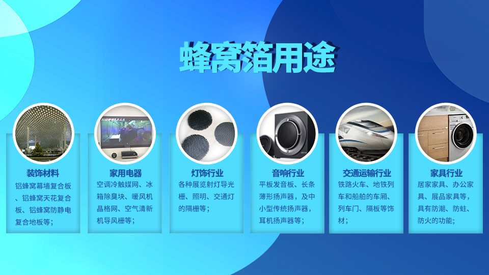 蜂窩鋁箔在市場上的應用范圍十分廣泛,可用于家電、燈飾、建筑、軌道交通、裝飾、電子產品、新能源汽車、船舶、航天、家具等多個行業領域中。